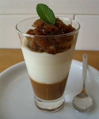 Barrejar el cafè, encara calent, amb el sucre i el licor. Congelar durant unes hores. Barrejar el iogurt amb la nata muntada. En una copa de postres, distribuir per capes el dolç de llet, la crema de iogurt i el granissat de cafè.